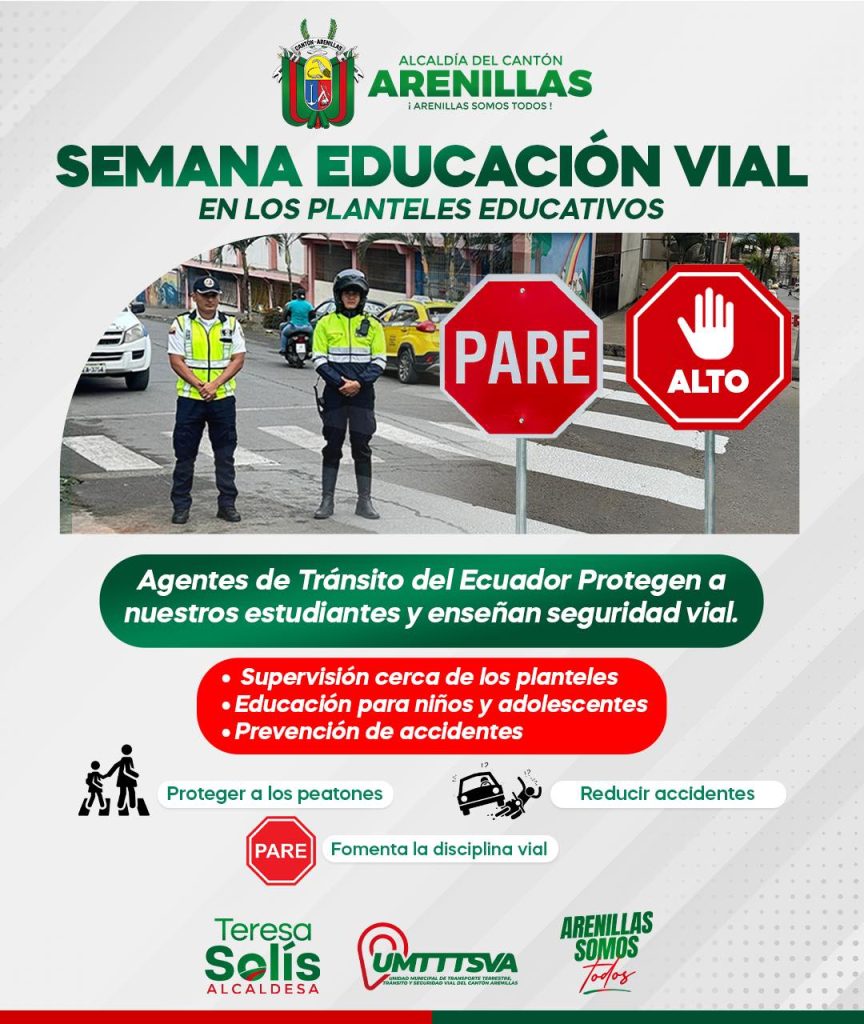 La Alcaldía de Arenillas, liderada por la Dra. Teresa Solís, a través de la Unidad de Tránsito Municipal en coordinación con la Comisión de Tránsito del Ecuador, impulsa acciones de educación y prevención vial en beneficio de nuestros estudiantes y la ciudadanía. Supervisión en los planteles educativos Charlas sobre seguridad vial Prevención de accidentes Protección […]